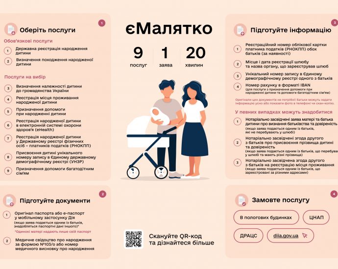 єМалятко — комплексна послуга для батьків новонароджених. За однією заявою, поданою онлайн, можна зареєструвати народження дитини та отримати до 9-ти державних послуг від різних органів влади, потрібних при народженні дитини.