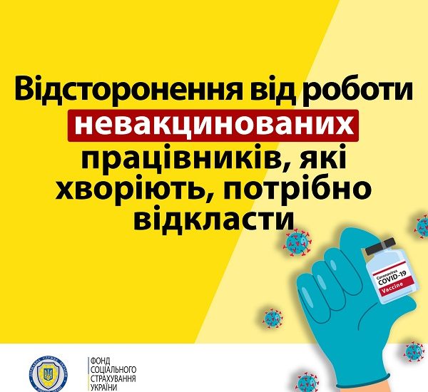 Відповідно до постанови Кабінету Міністрів України від 20.10.2021 № 1096, з 08 листопада керівники державних органів (державної служби), підприємств, установ та організацій мають забезпечити відсторонення від роботи працівників, щодо яких визначена обов’язковість профілактичних щеплень проти СOVID-19, і які відмовились або ухиляються від їх проведення. Виключенням є особи, які мають абсолютні протипоказання до проведення такого щеплення та надали відповідний медичний висновок.