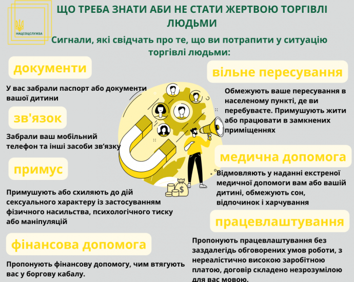 До Всесвітнього дня боротьби з торгівлею людьми – 30 липня, Національна соціальна сервісна служба України запускає інформаційну кампанію “Що треба знати аби не стати жертвою торгівлі людьми”. В рамках кампанії ми будемо публікувати необхідну інформацію, слідуючи якій, ви зможете вберегтись від торгівців людьми, а також вберегти своїх близьких. Сьогодні інформуємо Вас про основні сигнали, які свідчать про те, що ви потрапили у ситуацію торгівлі людьми: