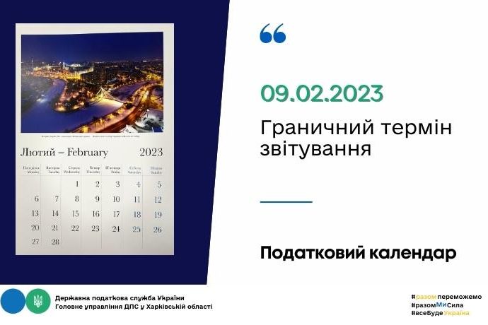 Головне управління ДПС у Харківській області повідомляє, що 9 лютого останній день подання: