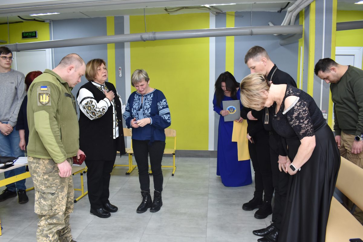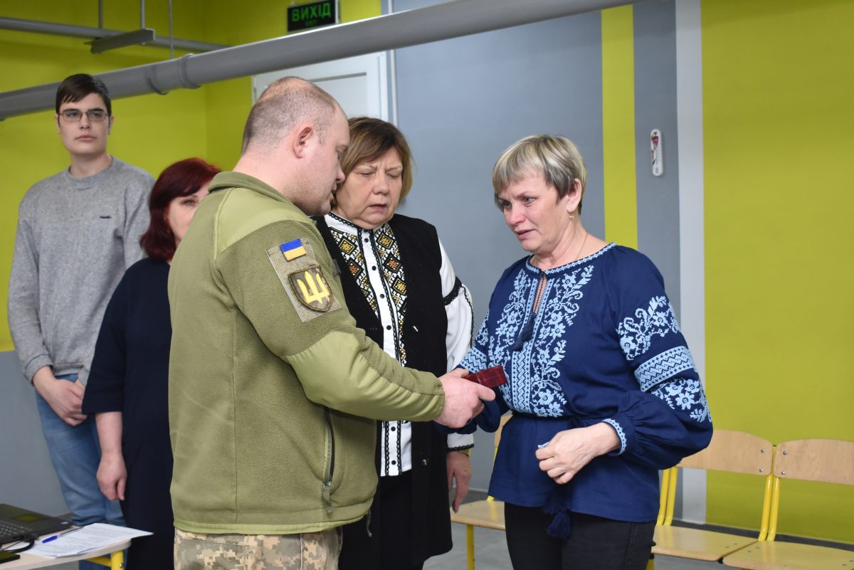 У церемонії нагородження державною нагородою, яка відбулася 15 лютого 2024 року, взяли участь Краснокутський селищний голова Ірина КАРАБУТ і начальник 4 відділу Богодухівського РТЦК та СП Харківської області майор Олександр ДУМЕНКО.