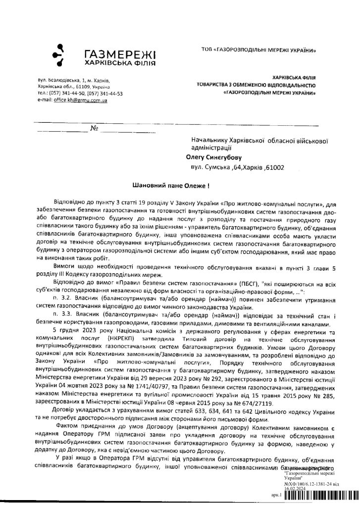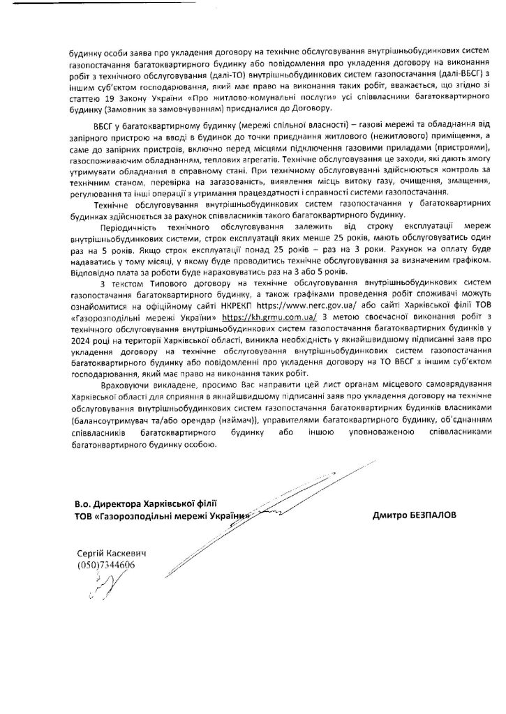 Доводимо до Вашого відома інформацію ХАРКІВСЬКОЇ ФІЛІЇ ТОВАРИСТВА З ОБМЕЖЕНОЮ ВІДПОВІДАЛЬНІСТЮ «ГАЗОРОЗПОДІЛЬНІ МЕРЕЖІ УКРАЇНИ» щодо укладення договорів на технічне обслуговування внутрішньобудинкових систем газопостачання багатоквартирного будинку з оператором газорозподільної системи або іншим суб’єктом господарювання, який має право на виконання таких робіт.