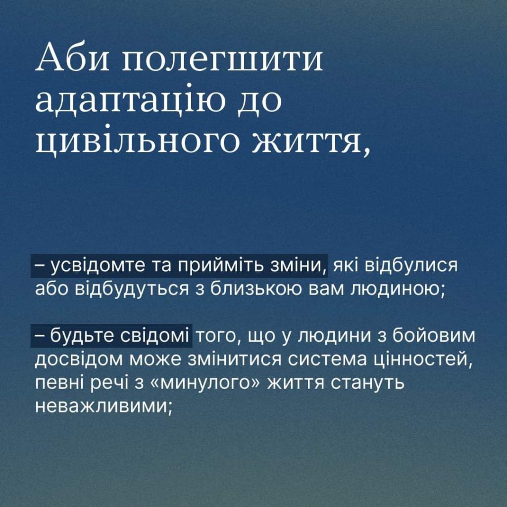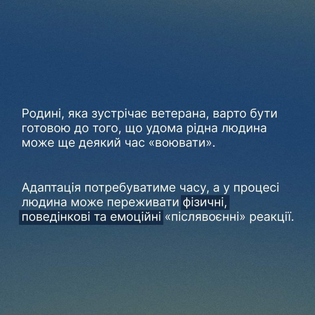 🔸Родині, яка чекає маму чи тата, сина, дочку або брата з війни, варто бути готовою до того, що вони можуть повернутися «іншими». Що рідна людина ще деякий час «воюватиме» і потребуватиме нашого терпіння. Ось кілька порад, які допоможуть підготуватися до зустрічі з військовими та полегшать період адаптації.