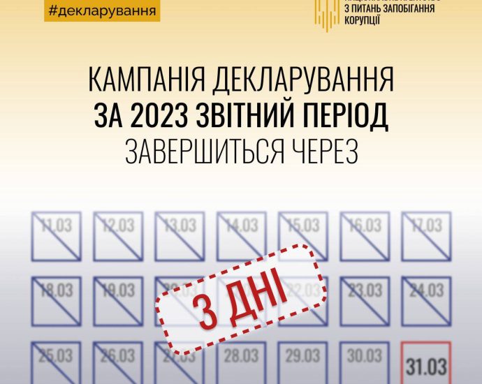 Не баріться! До кінця кампанії декларування за 2023 звітний період залишилось 3 дні. ➡️ Подати декларацію. (https://public.nazk.gov.ua/)