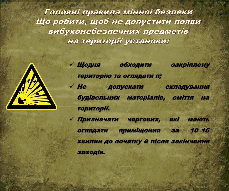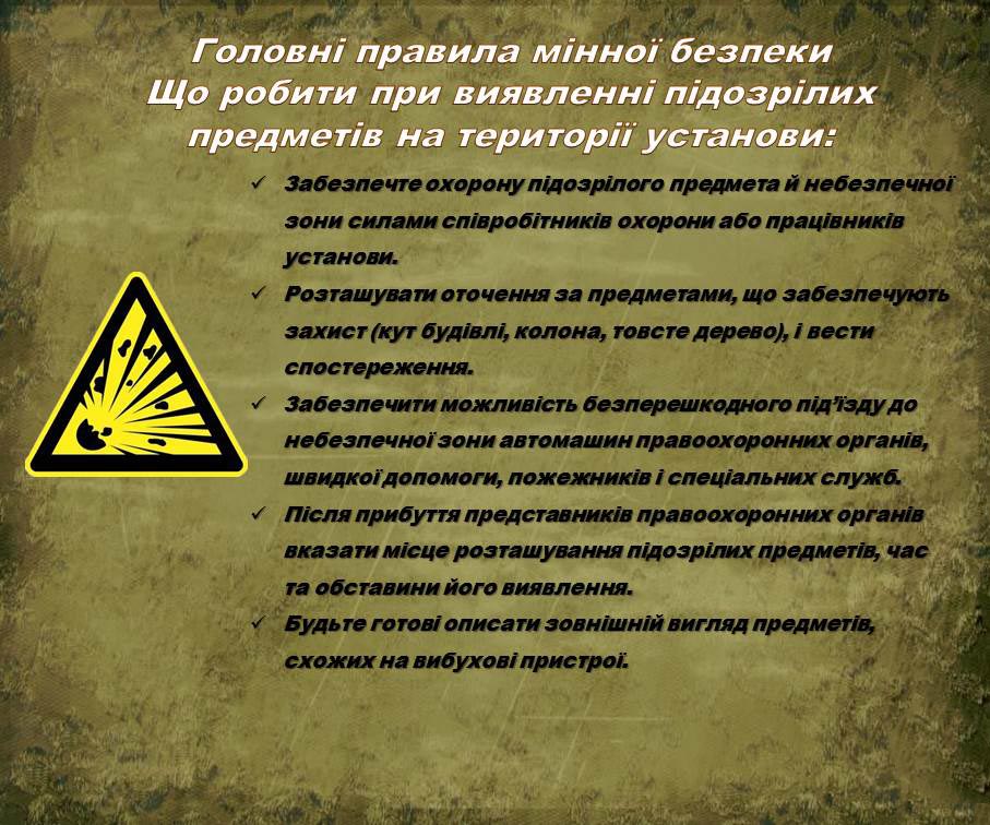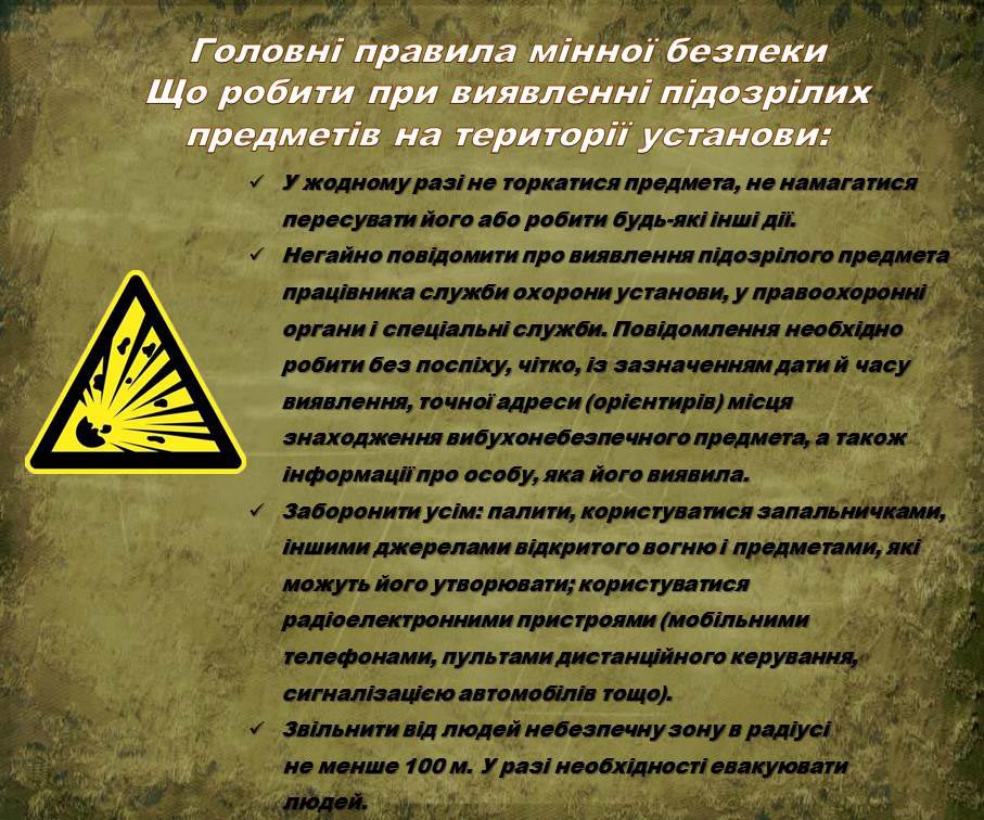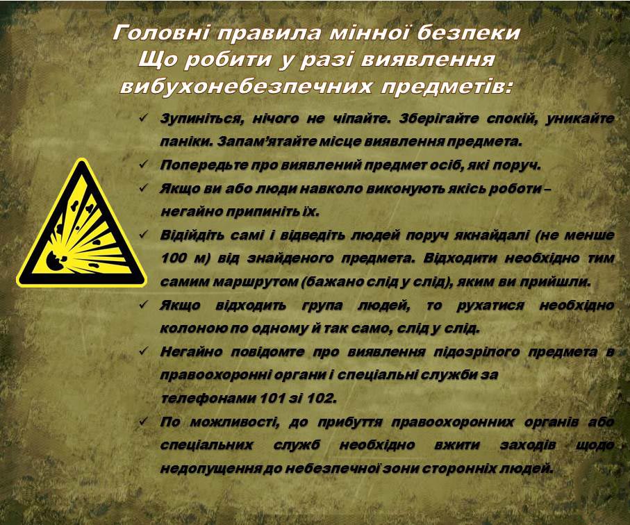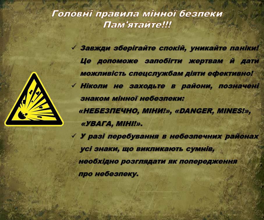 Ми підготували для вас головні правила з мінної безпеки. Сподіваємось, що вони допоможуть вам зберегти власне життя та вберегти близьких від біди. Уважно ознайомтеся з цими правилами, запам’ятайте й розкажіть про них друзям і рідним, а насамперед – дітям!
