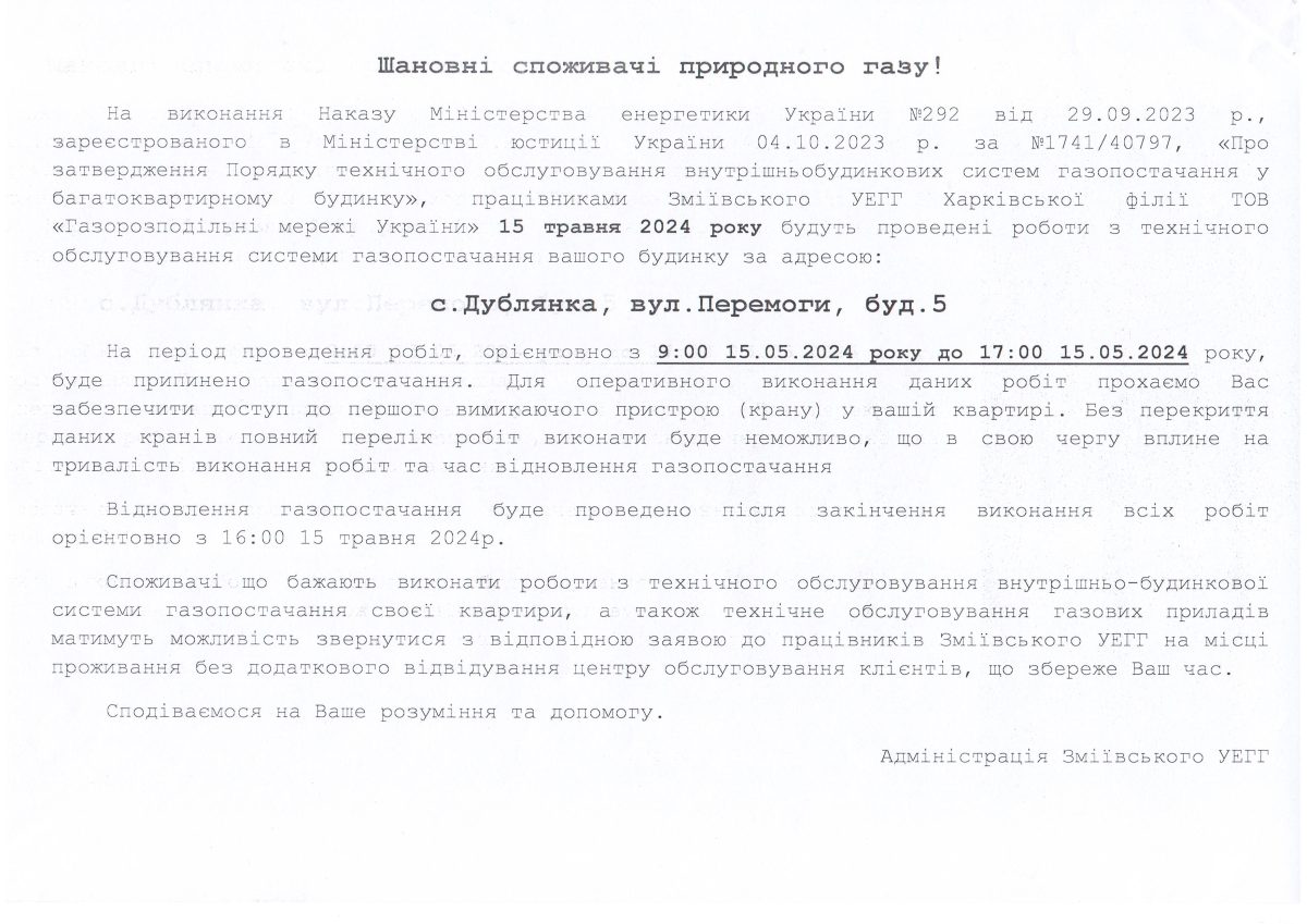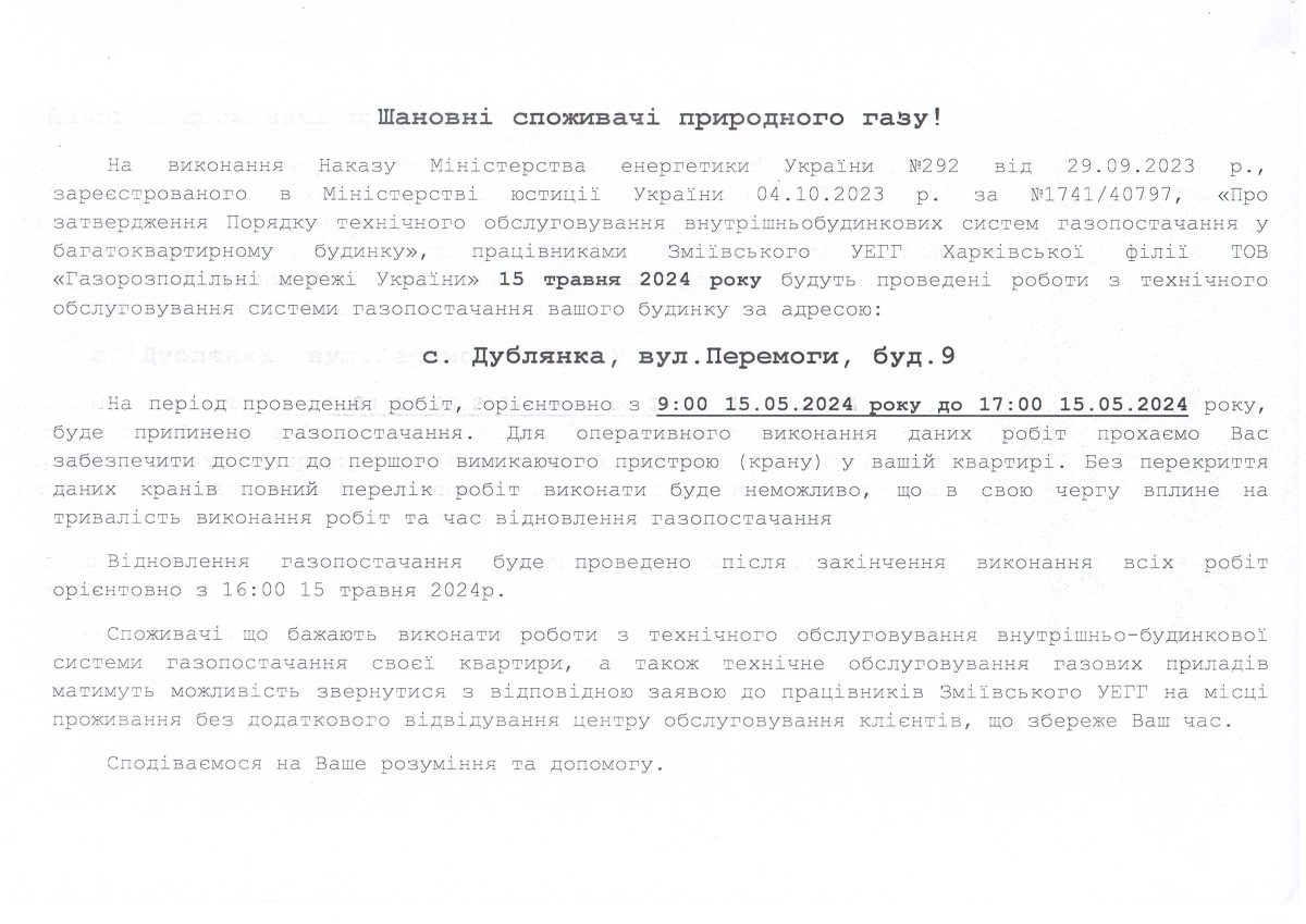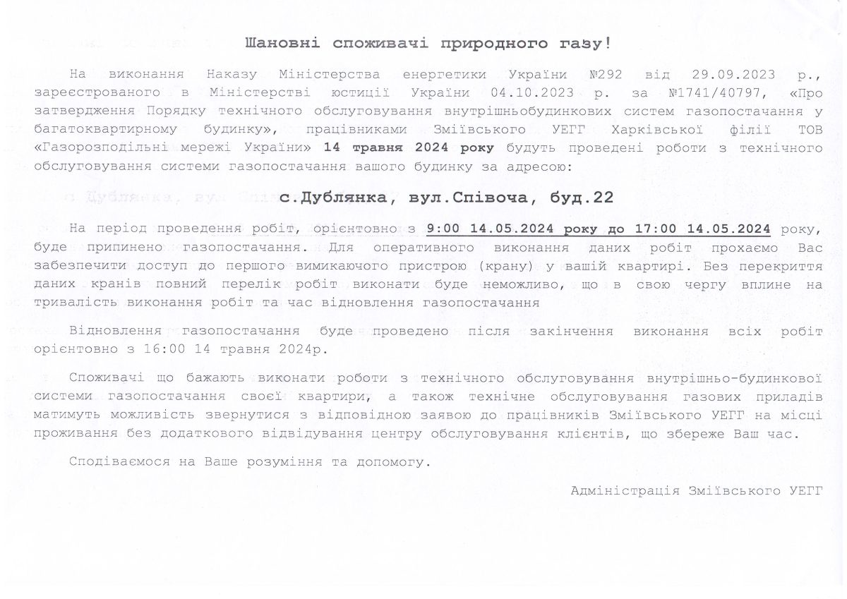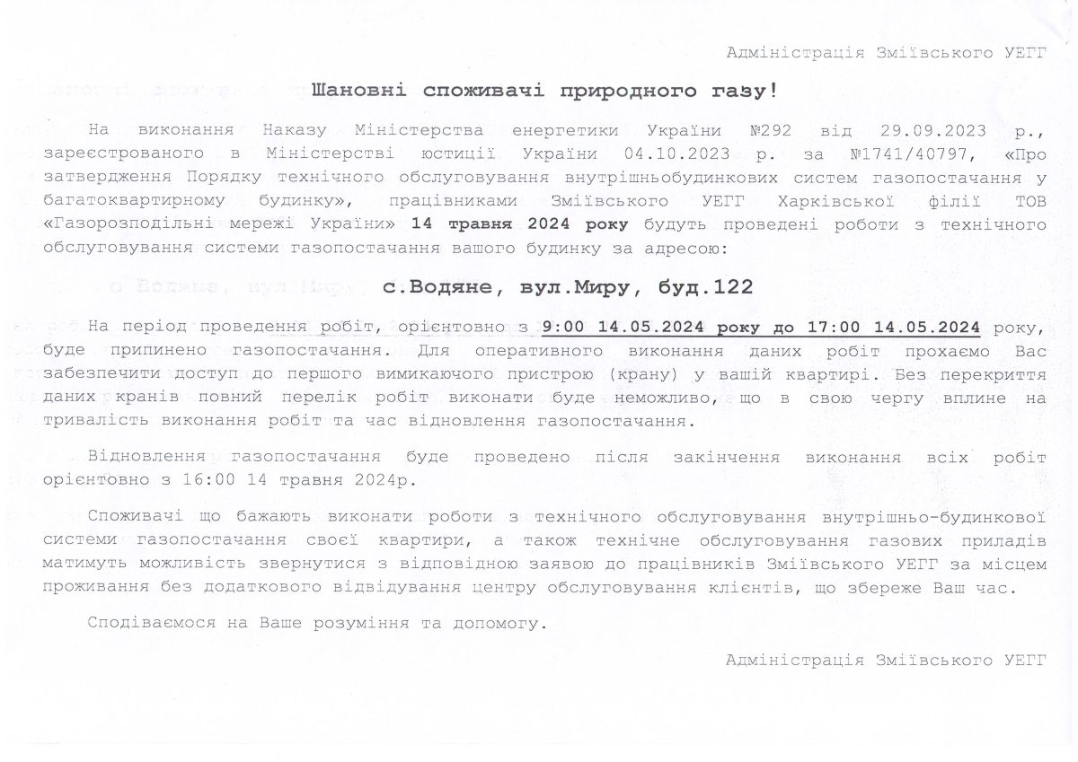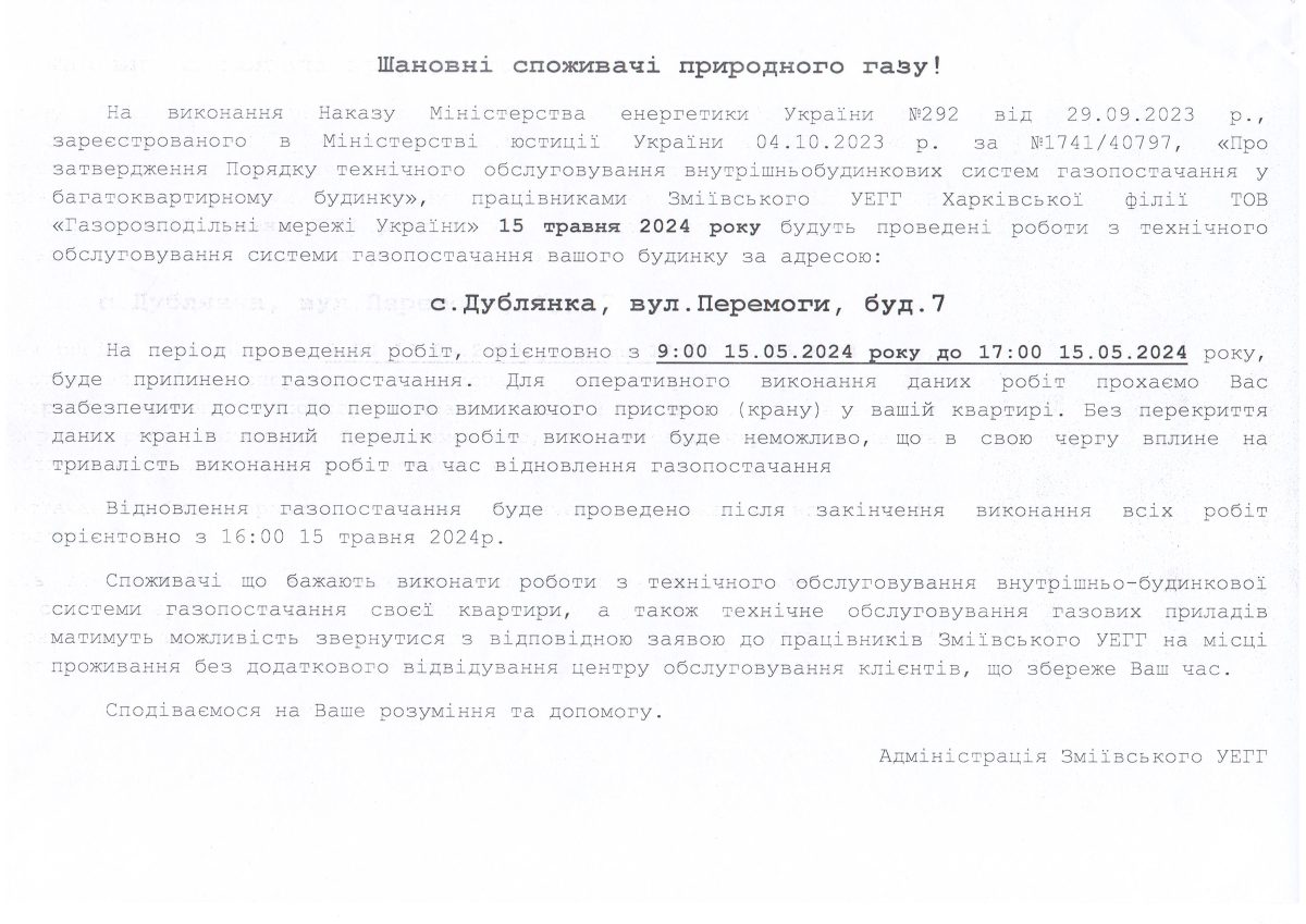 Зміївське УЕГГ Харківської філії ТОВ «Газорозподільні мережі України» інформує, що на виконання Наказу Міністерства енергетики України № 292 від 29.09.2023, зареєстрованого в Міністерстві юстиції України 04.10.2023 за № 1741/40797, «Про затвердження Порядку технічного обслуговування внутрішньобудинкових систем газопостачання у багатоквартирному будинку» для проведення робіт буде припинено газопостачання багатоповерхових житлових будинків за адресами: