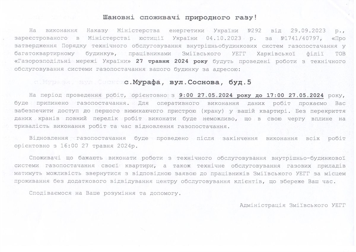 Зміївське УЕГГ Харківської філії ТОВ «Газорозподільні мережі України» інформує, що на виконання Наказу Міністерства енергетики України № 292 від 29.09.2023, зареєстрованого в Міністерстві юстиції України 04.10.2023 за № 1741/40797, «Про затвердження Порядку технічного обслуговування внутрішньобудинкових систем газопостачання у багатоквартирному будинку» для проведення робіт буде припинено газопостачання багатоповерхових житлових будинків за адресами: