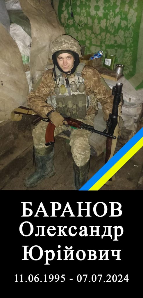 07 липня 2024 року під час виконання конституційного обов’язку щодо оборони України, захисту її суверенітету, територіальної цілісності і недоторканості від російської агресії при виконання бойового завдання біля н.п. Богданівка Донецької області загинув мешканець с. Мурафа солдат БАРАНОВ Олександр Юрійович, 11 червня 1995 р.н., стрілець 2 піхотного відділення 2 піхотного взводу 1 піхотної роти військової частини.