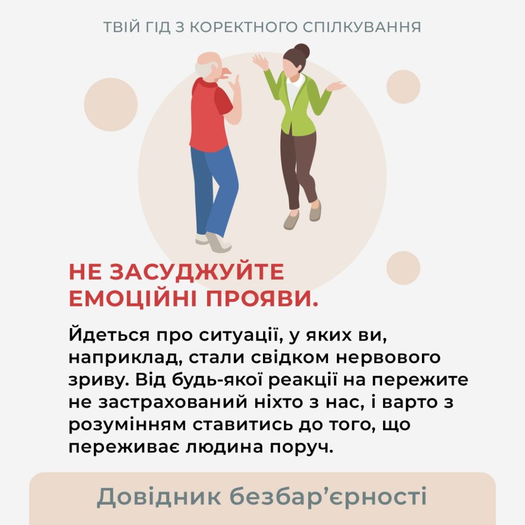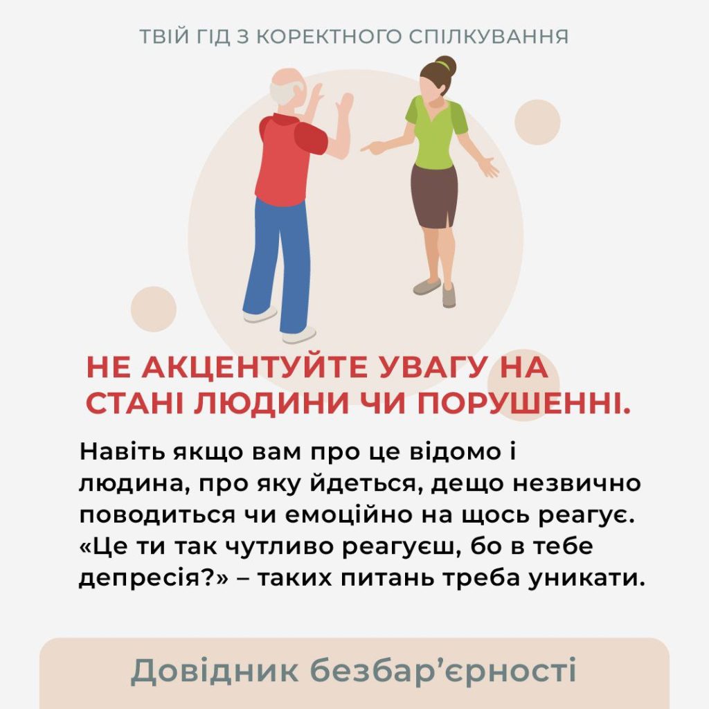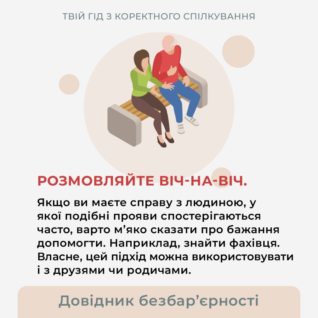 Це правило діє, якщо говоримо не лише про чутливу комунікацію, хоча, власне, це загалом основа нормального спілкування. Однак, якщо йдеться про взаємодію з людьми, які мають тимчасові труднощі, пов’язані з ментальним здоров’ям, правило особливо актуальне, бо опинитись у вразливому стані може будь-хто з нас.