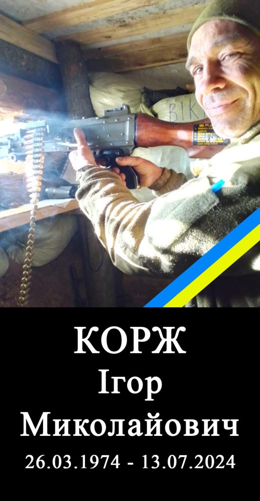 З глибоким сумом повідомляємо, що 13 липня 2024 року під час виконання бойового завдання в районі н.п. Торецьк Донецької області, відданий військовій присязі на вірність українському народу, мужньо виконавши військовий обов’язок, загинув наш земляк – стрілець першого стрілецького відділення третього стрілецького взводу третьої стрілецької роти військової частини солдат КОРЖ Ігор Миколайович 26.03.1974 року народження.