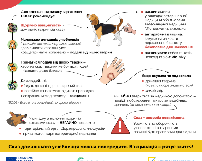 Вакцинація проти сказу – це не лише відповідальність власника тварини, а й гарантія безпеки для всього суспільства. Бережіть себе та своїх близьких! Додаткова інформація про небезпеку сказу в наступній інфографіці. Просимо розмістити інформацію та інфографіку на сайті міської ради.