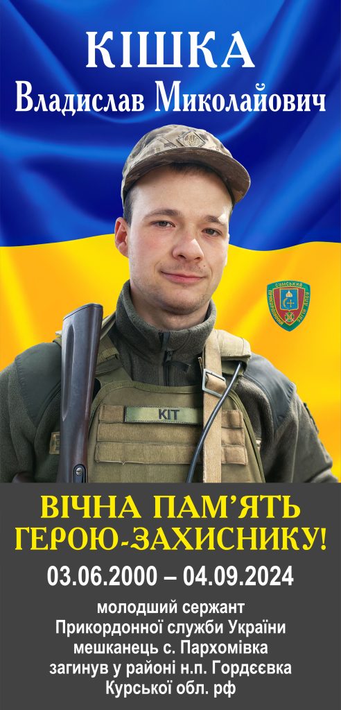04.09.2024 року під час виконання бойових завдань в районі населеного пункту Гордєєвка Курської області рф, вірний військовій присязі, захищаючи територіальну цілісність та державний суверенітет України, загинув інспектор прикордонної служби 2 категорії – гранатометник другого відділення інспекторів прикордонної служби першої прикордонної застави другого відділення прикордонної служби (тип С) прикордонної комендатури швидкого реагування старший солдат КІШКА Владислав Миколайович, 03.06.2000 року народження, мешканець с. Пархомівка. Загибель Владислава КІШКИ – це не тільки біль родини, це біль усієї громади, це біль усієї країни. Справжній патріот, вірний захисник України. Таким він назавжди залишиться у пам’яті рідних та односельчан, а його ім’я навіки буде взірцем мужності, патріотизму та незламності.