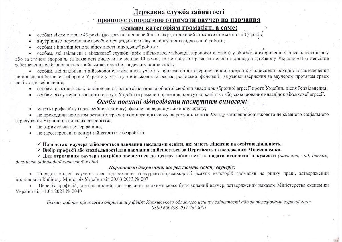 Державна служба зайнятості пропонує одноразово отримати ваучер на навчання деяким категоріям громадян
