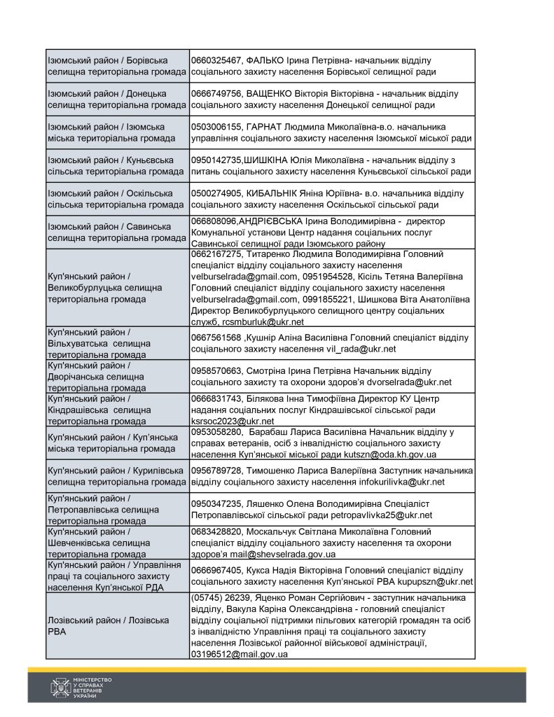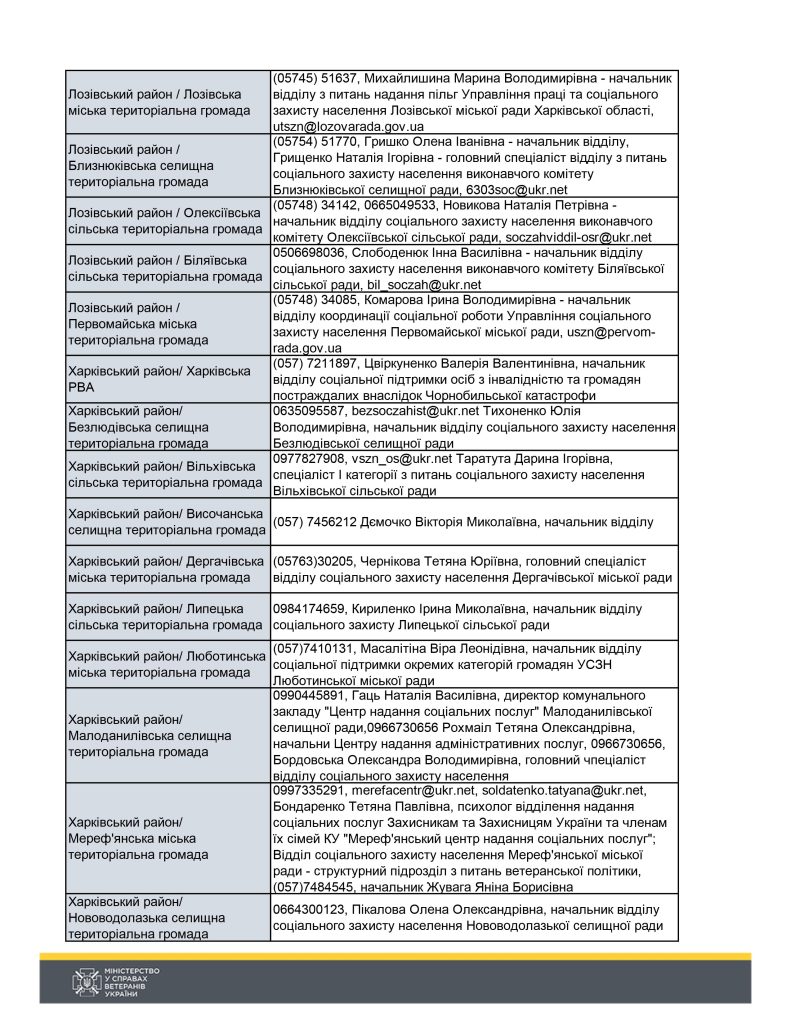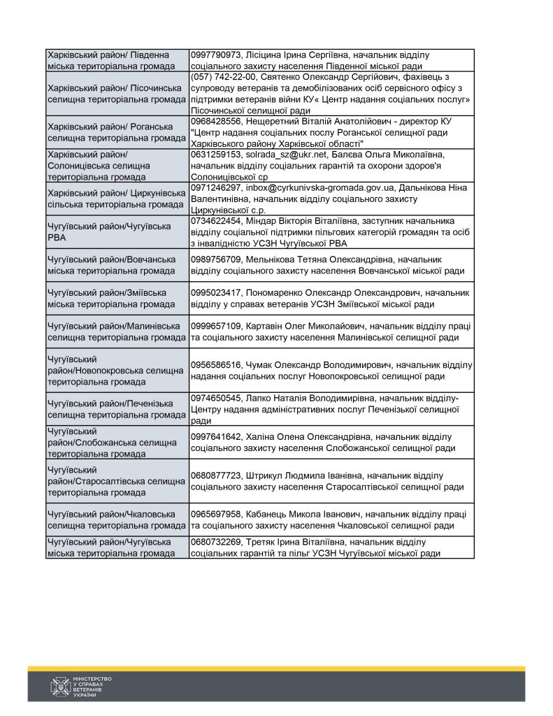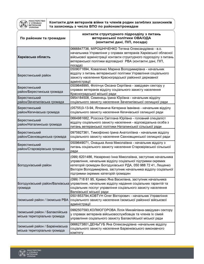 Контакти для ветеранів війни та членів родин загиблих захисників та захисниць по районах/громадах Харківськї області