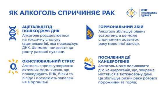 - Алкоголь розщеплюється до ацетальдегіду — токсичної сполуки, яка зв’язується з ДНК і пошкоджує її. Це може призвести до неконтрольованого росту клітин і формування ракової пухлини.