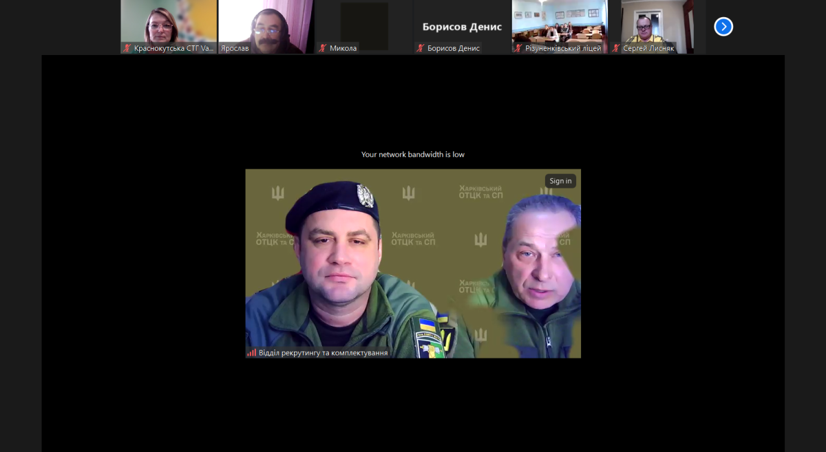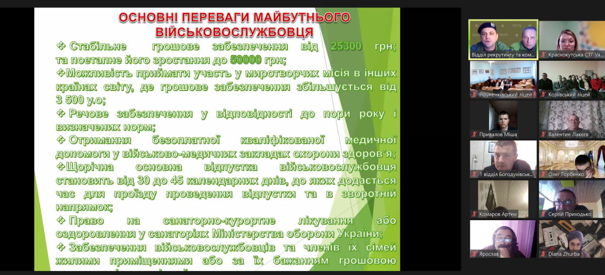 13 березня 2025 року здобувачі освіти 10-х та 11-х класів закладів загальної середньої освіти, вчителі предмета “Захист України” Краснокутської громади та представники відділу освіти Краснокутської селищної ради взяли участь у профорієнтаційній онлайн-конференції з представниками військових закладів вищої освіти України.