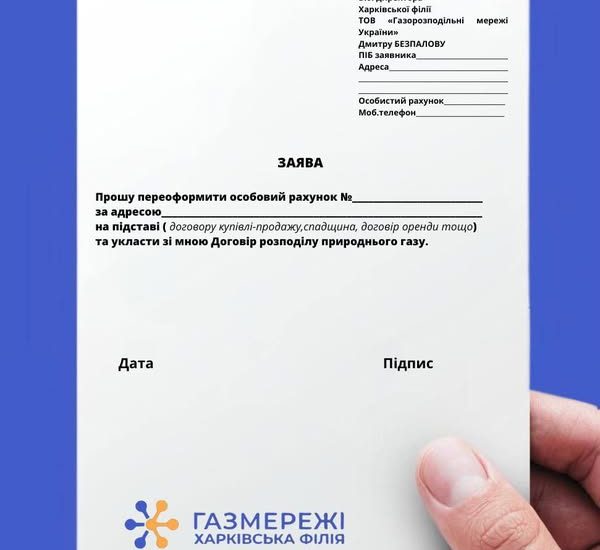 Для переоформлення особового рахунку, пов’язаного із зміною власника домоволодіння, новому власнику житла потрібно звернутися до найближчого центру обслуговування клієнтів Харківської філії «Газмережі», написати заяву та надати копії наступних документів: