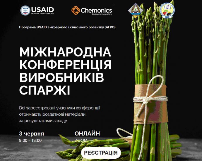 03 червня 2021 року Інститут овочівництваі баштанництва НААН України за підтримки Програми USAID аграрного і сільського розвитку, буде проводити «Міжнародну конференцію виробників спаржі», у форматі ZOOM. Початок заходу о 09.00.
