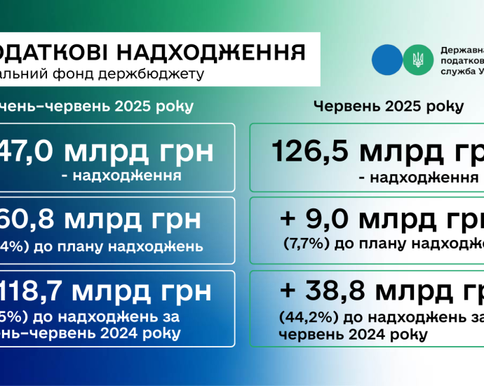 +10,4 % (60,8 млрд грн) – до плану надходжень за січень – червень 2025 року;