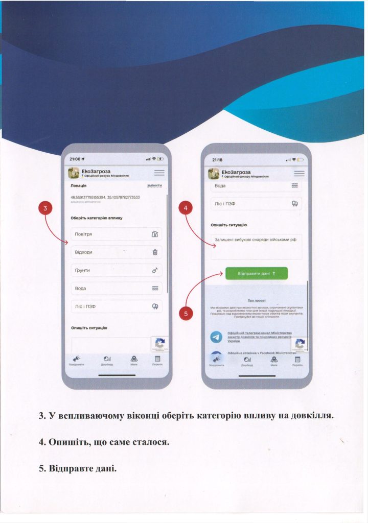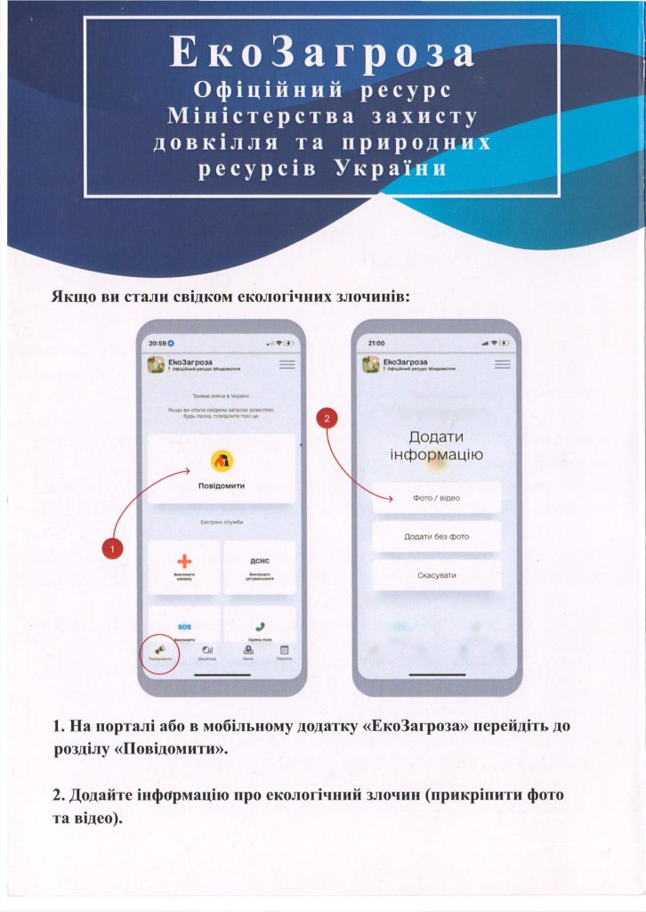 Українці також можуть повідомляти про всі факти екологічних злочинів проти довкілля, свідками яких вони стали. Наприклад, про горіння військової техніки; пожежі в лісі; розлив нафтопродуктів чи отруйних речовин у ґрунт або водойму; викид отруйних речовин у повітря тощо. Посилання на вебресурс ЕкоЗагроза, завантажити додаток можна в GooglePlay і AppStore.