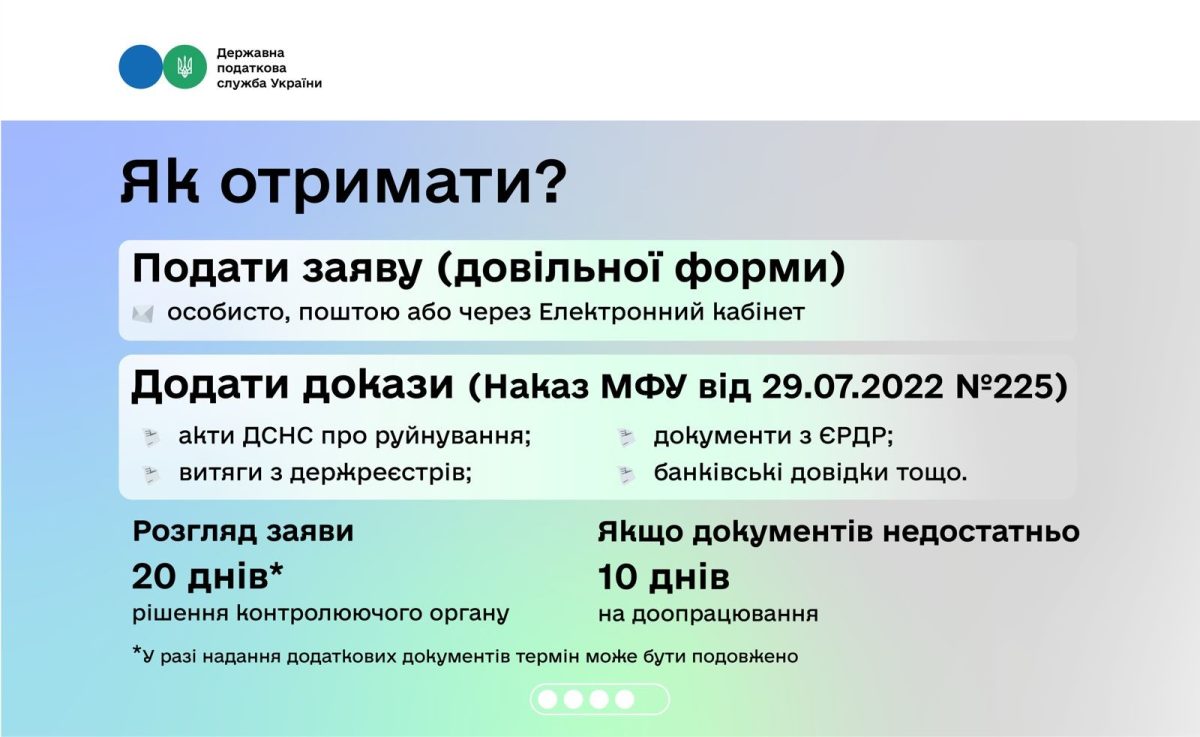 Платник податків має подати до контролюючого органу заяву довільної форми з документами на підтвердження.