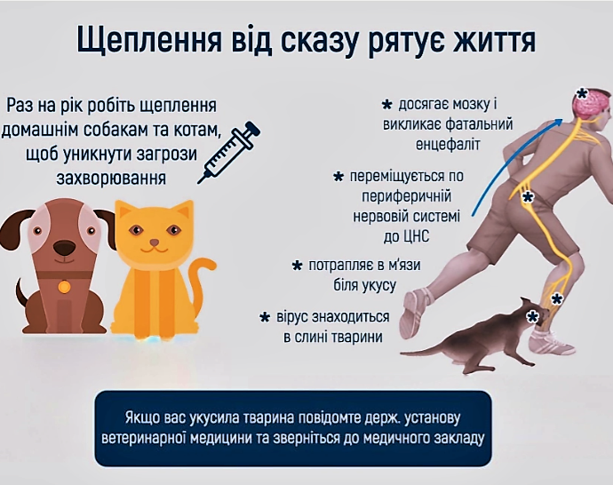 Сказ – небезпечне вірусне захворювання, що уражає як тварин, так і людей. Найчастіше інфекція передається через укуси або подряпини від заражених тварин, адже вірус міститься у їхній слині. Він також може потрапити в організм через пошкоджену шкіру або слизові оболонки при безпосередньому контакті зі слиною хворої тварини. Збудник сказу вражає центральну нервову систему, викликаючи незворотні ураження головного мозку, і майже у 100% випадків призводить до смерті за відсутності своєчасної профілактики. Основними переносниками інфекції є собаки, коти, а також дикі тварини — лисиці, вовки, єнотовидні собаки та деякі гризуни.