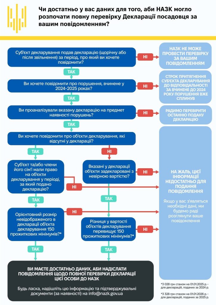 Підставою для початку повної перевірки декларації може бути лише повідомлення, що містить конкретні фактичні дані, що можуть бути перевірені. Окрім того, такі дані мають відрізнятися від достовірних відомостей на суму понад 150 ПМ для працездатних осіб (мінімальне порогове значення для адміністративної відповідальності за недостовірне декларування). Якщо є підтвердні документи фактів можливого порушення, обов’язково додайте їх до повідомлення.