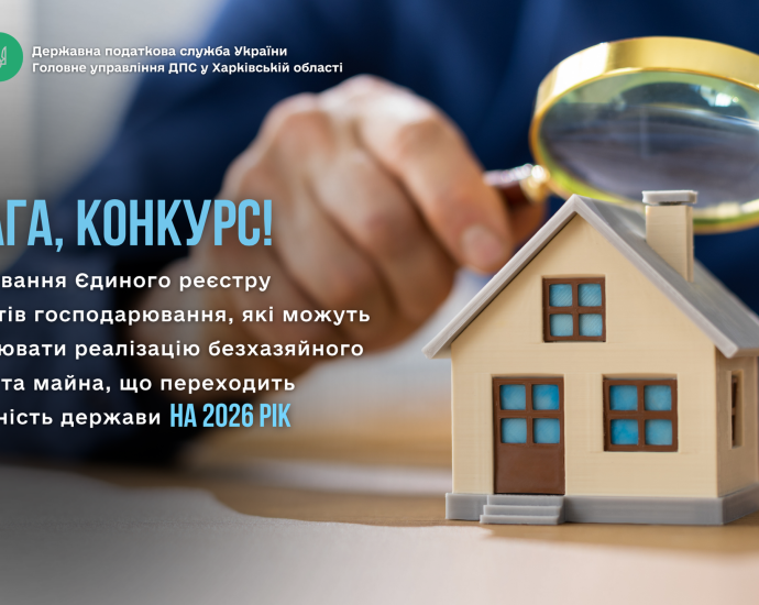 Головне управління ДПС у Харківській області проводить конкурс з формування Єдиного реєстру суб’єктів господарювання, які можуть здійснювати реалізацію безхазяйного майна та майна, що переходить у власність держави на 2026 рік.