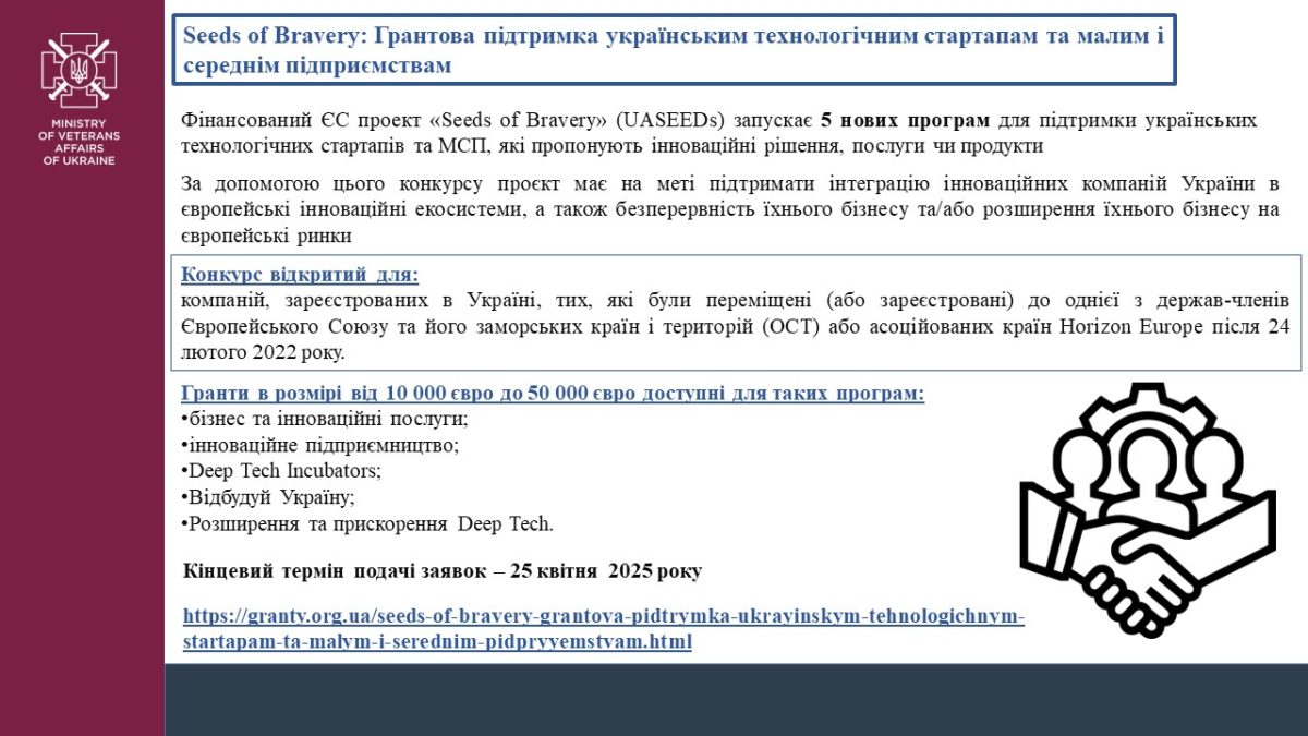 - Seeds of Bravery: Грантова підтримка українським технологічним стартапам та малим і середнім підприємствам https://granty.org.ua/seeds-of-bravery-grantova-pidtrymka-ukrayinskym-tehnologichnym-startapam-ta-malym-i-serednim-pidpryyemstvam.html