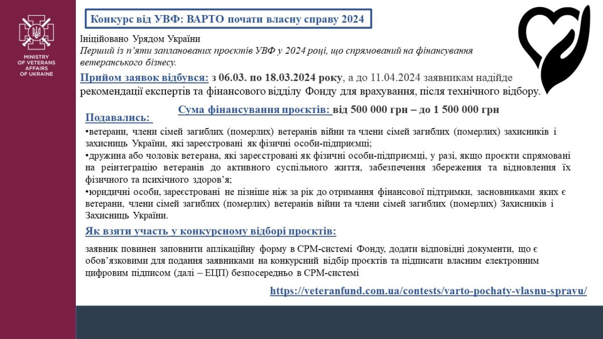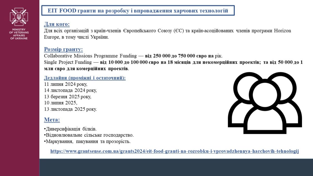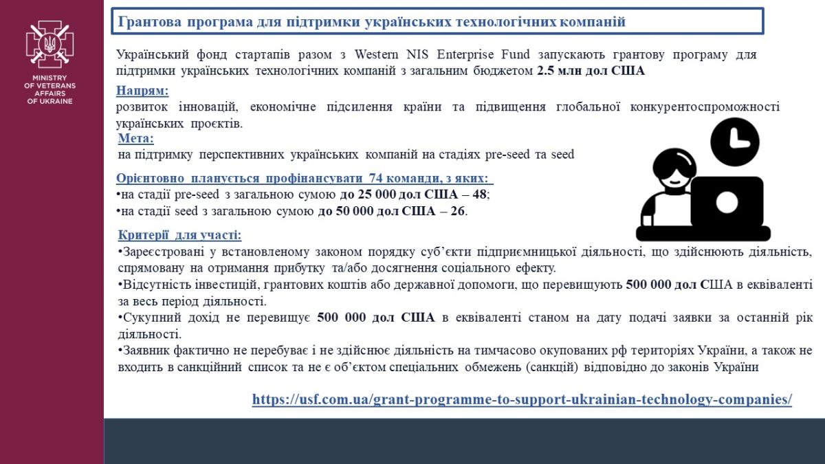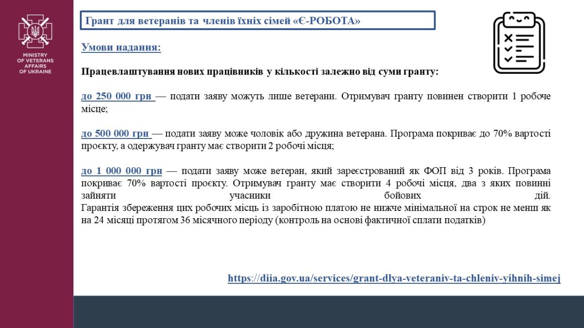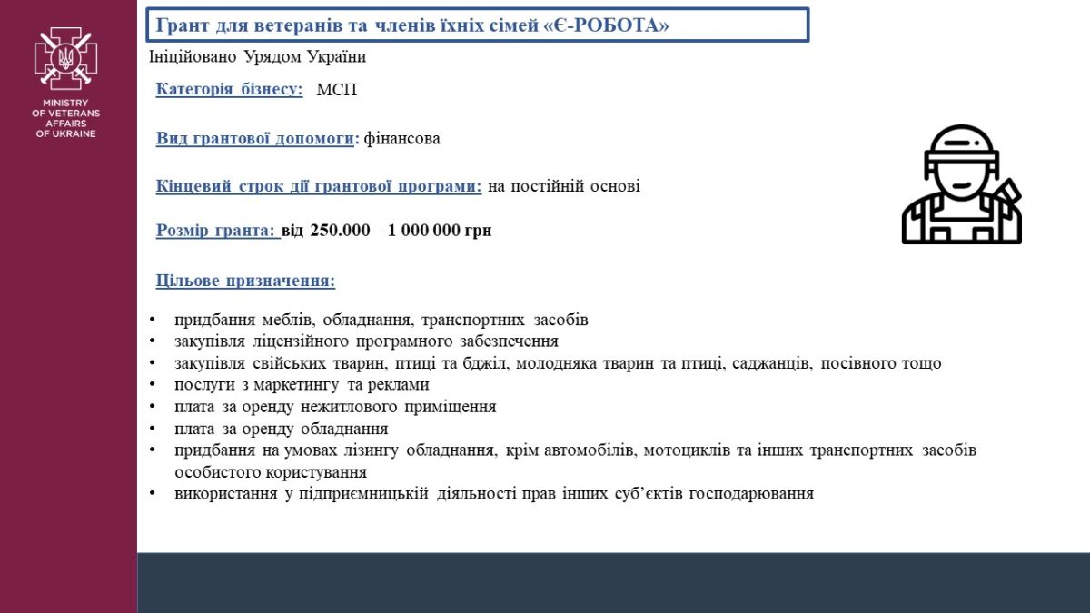 - Грант для ветеранів та членів їхніх сімей «Є-РОБОТА» (250.000 – 1 000 000 грн) https://diia.gov.ua/services/grant-dlya-veteraniv-ta-chleniv-yihnih-simej