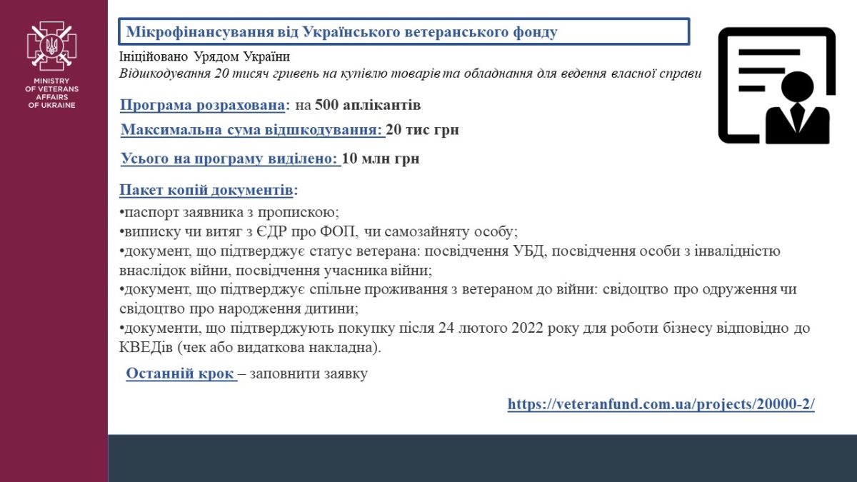 Також діє програма мікрофінансування від Українського ветеранського фонду Мінветеранів: відшкодування 20 тис. грн на купівлю товарів та обладнання для ведення власної справи.