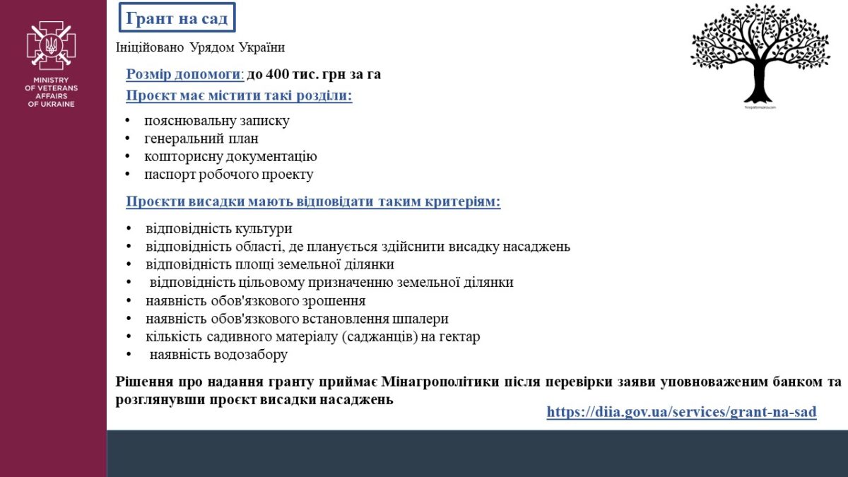 - Грант на сад (до 400 тис. грн за га, проєкт Мінагрополітики) https://diia.gov.ua/services/grant-na-sad