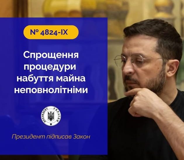 Президент України підписав Закон №4824-ІХ, який вже отримала Верховна Рада. Документ спрямований на вдосконалення порядку набуття права власності неповнолітніми.